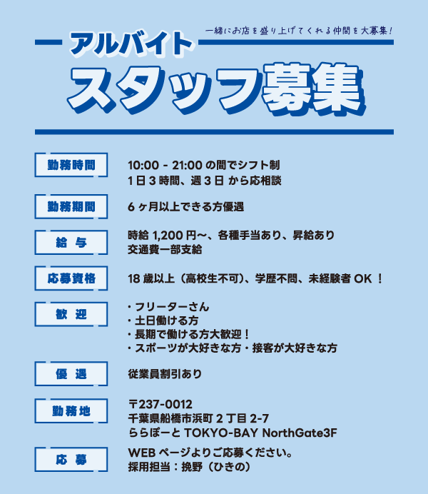 千葉県船橋市浜町2丁目2-7 ららぽーとTOKYO-BAY NorthGate3F