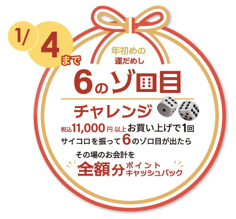 1/4(日)までの期間中、店頭で¥11,000(税込)以上お買い上げで1回チャレンジ!サイコロを2つ同時に振って、6のゾロ目が出たら