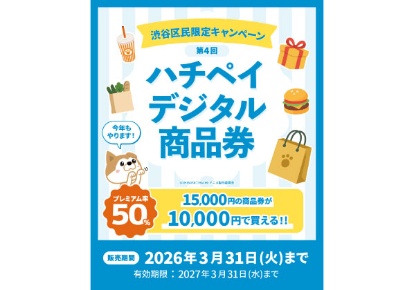 プレミアム率50%!第4回 ハチペイデジタル商品券2/2~3/31まで!渋谷店でご利用できます