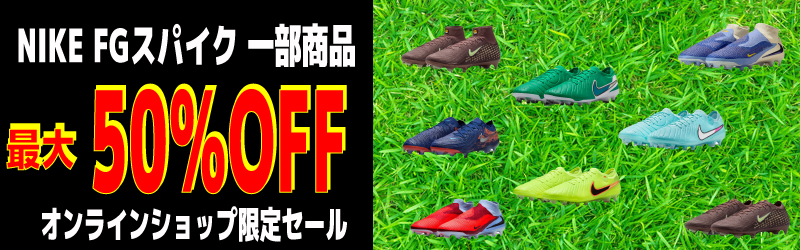 オンラインショップ限定で、旧モデルのナイキFG(芝用)スパイクが最大で50%offとなる特別セールを開催中です。
