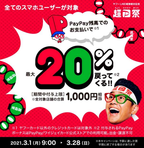 <PayPay>最大1,000円相当 20%戻ってくるキャンペーン
