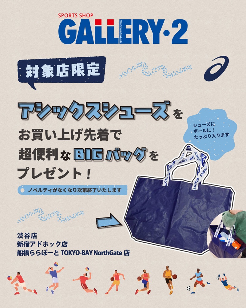 2025.12.28 対象店舗でアシックスシューズを買ってBIGバッグをGETしよう! 船橋ららぽーとTOKYO-BAY NorthGate店 渋谷店1F 渋谷店2F 新宿アドホック店 渋谷店/新宿アドホック店 船橋ららぽーとTOKYO-BAY NorthGate店 限定ノベルティキャンペーン開催中 対象店舗にて、アシックスシューズをお買い上げ先着で 超便利なアシックスBIGバッグをプレゼント! ノベルティがなくなり次第終了いたします ぜひ!お早めにどうぞ(^_-)-☆ シューズもボールも一緒に入っちゃう頑丈で便利なバッグです。 お見逃しなくっ! この投稿をInstagramで見る ギャラリー・2渋谷店 フットボール(@gallery2_football)がシェアした投稿 対象店舗