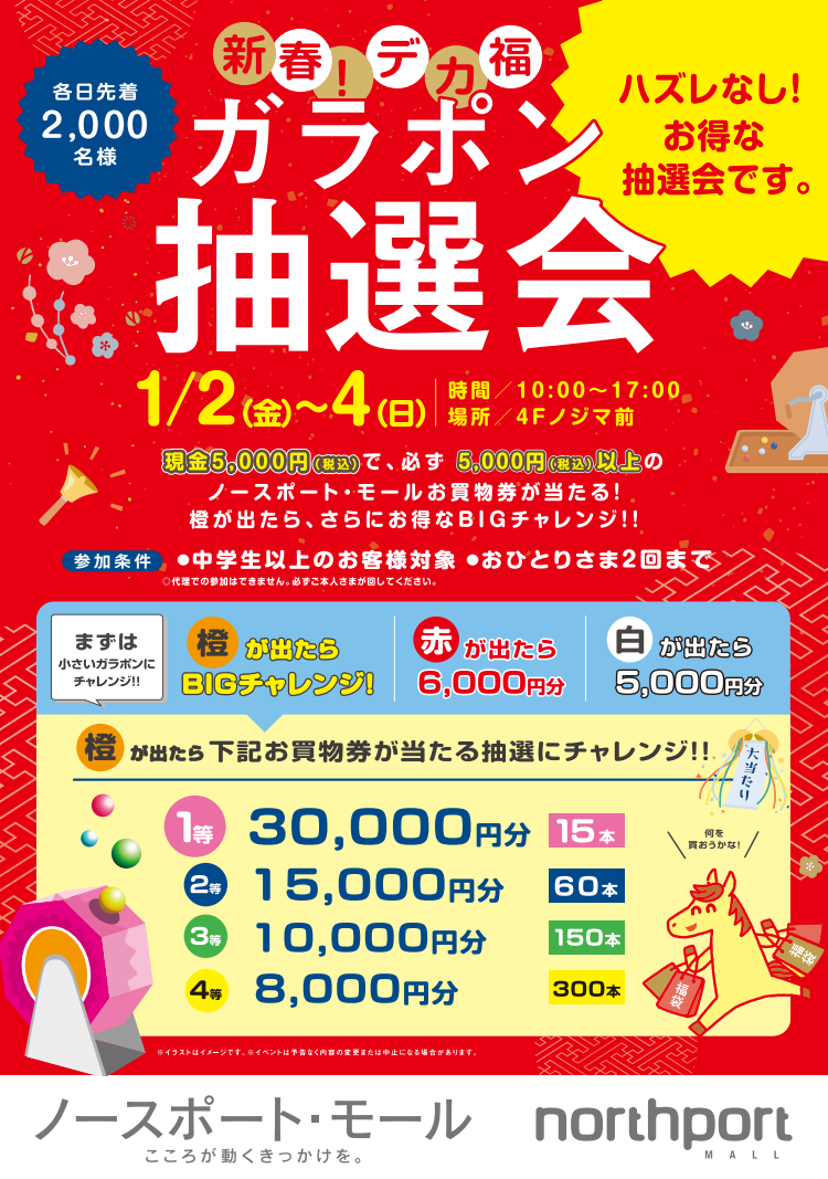 1月2日(金)~1月4日(日)までの期間、ノースポート・モール4Fノジマさん前にて『新春!デカ福 ガラポン抽選会』を開催します。