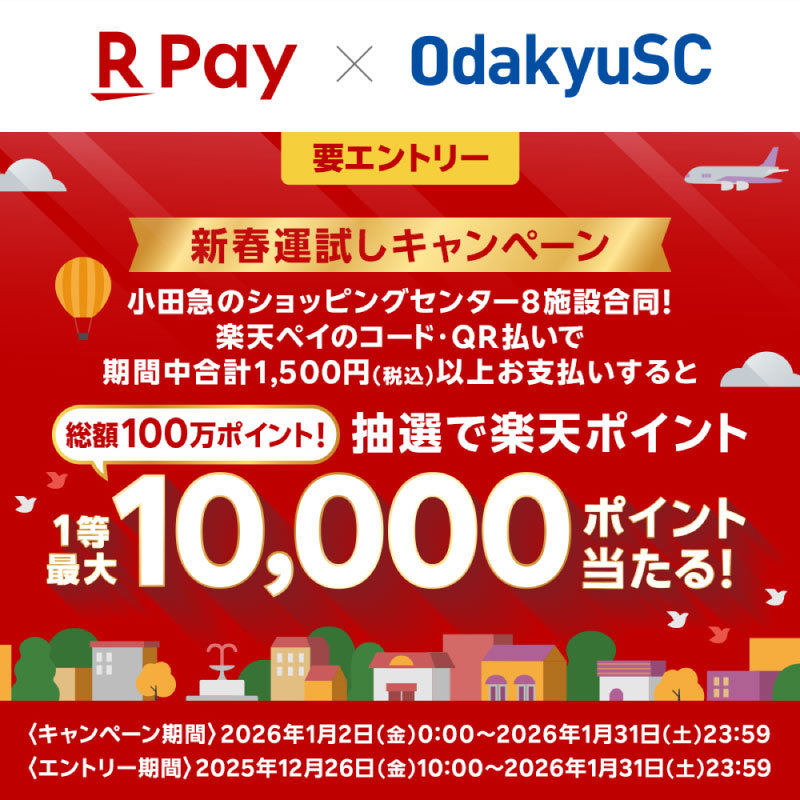 小田急のショッピングセンターの対象店舗で、楽天ペイアプリからエントリーの上、期間中合計で1,500円(税込)以上、楽天ペイでQR・コード決済をすると楽天ポイントが抽選で最大10,000ポイント当たる新春運試しキャンペーンを開催!