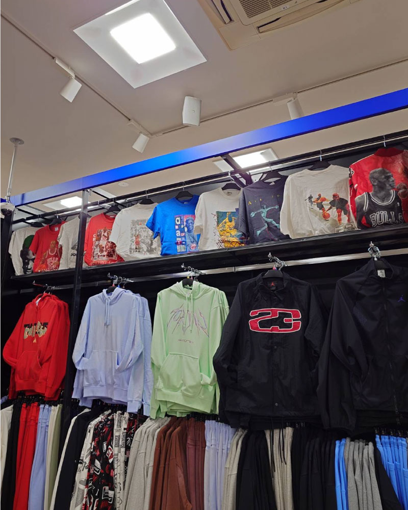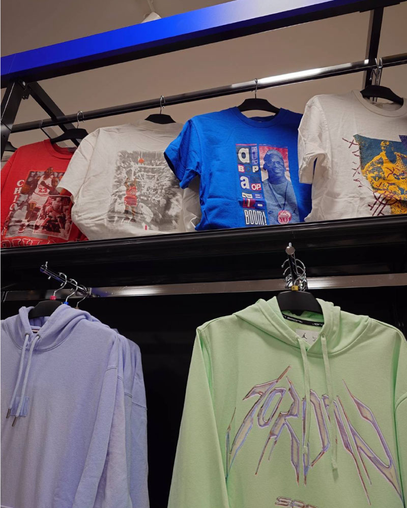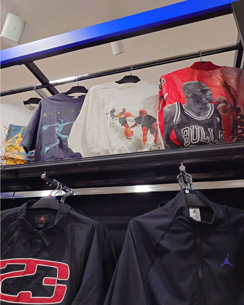こちらもお宝!バスケットアパレルコーナーの上部にジョーダンのTシャツを展示しています。