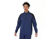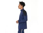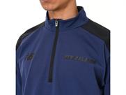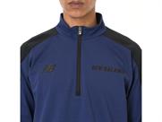 90年代のクラシックフットボールからインスピレーションを受けたBLACKOUTコレクション。袖の異素材切り替えが特徴のハーフジップトップ。ストレッチ性のニット素材を使用し、右胸のNBロゴ、左胸のNBロゴグラフィックをクールなカラーで展開。トレーニングやプレーで活躍するアイテム。