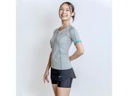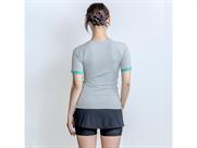 袖付きトップスが上半身をカバーし、コンパクトなスカート2in1でシルエットを整える。