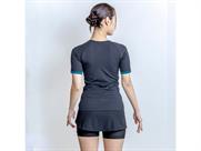 袖付きトップスが上半身をカバーし、コンパクトなスカート2in1でシルエットを整える。