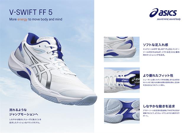 V-SWIFT FF 5は、よりしなやかでスムーズなフットワークを支えるインドアコート用シューズです。