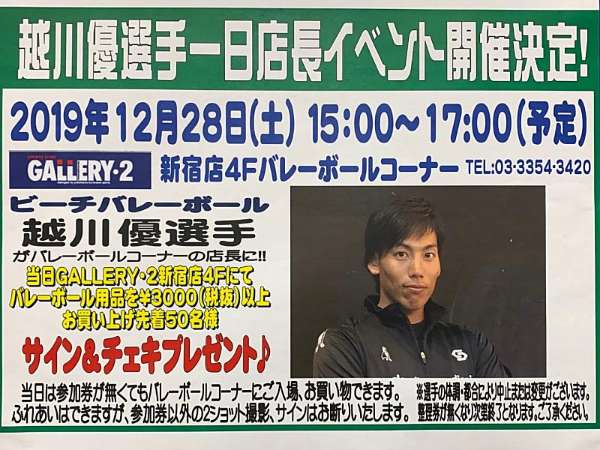 2019年12月28日(土)GALLERY・2新宿店4Fバレーボールコーナーに越川優選手が一日店長に就任します!